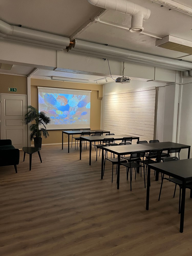 Tilan yhteydessä on myös varasto, johon osan kalusteita voi siirtää, jos tarvitsee enemmän vapaata tilaa. Koko tilan henkilömäärä on noin 40-45 henkilöä